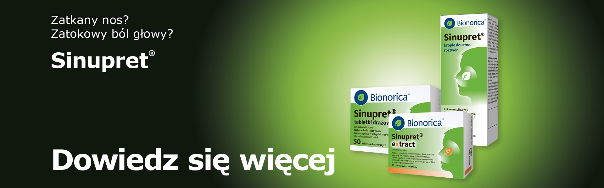 Nazwa produktu leczniczego: Sinupret, tabletki drażowane. Produkt złożony. Postać farmaceutyczna: tabletki drażowane. Wskazania: Wspomagająco w ostrych i przewlekłych stanach zapalnych zatok. Produkt roślinny jest przeznaczony do tradycyjnego stosowania w wymienionych wskazaniach i jego skuteczność opiera się na długim okresie stosowania i doświadczeniu. Podmiot odpowiedzialny: Bionorica SE, 92308 Neumarkt, Niemcy. Informacji o leku udziela: Bionorica Polska Sp. z o.o., ul. Hrubieszowska 6B, 01-209 Warszawa