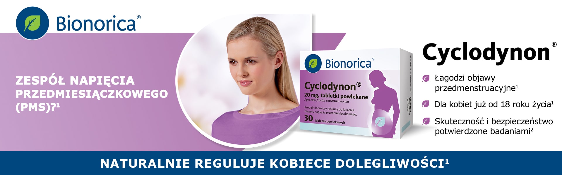 Nazwa produktu leczniczego: Cyclodynon, 20 mg, tabletki powlekane . Jedna tabletka powlekana zawiera 20 mg wyciągu (jako suchy wyciąg) z Vitex agnus-castus L. fructus (owoc niepokalanka zwyczajnego) (DERpierwotny 7-11:1). Rozpuszczalnik ekstrakcyjny: 70% etanol (V/V). Substancja pomocnicza o znanym działaniu: laktoza jednowodna: 50,00 mg. Postać farmaceutyczna: Tabletki powlekane. Wskazanie terapeutyczne do stosowania: Produkt leczniczy roślinny do leczenia objawów zespołu napięcia przedmiesiączkowego. Podmiot odpowiedzialny: Bionorica SE, 92308 Neumarkt, Niemcy. Informacji o leku udziela: Bionorica Polska Sp. z o.o., ul. Hrubieszowska 6B, 01-209 Warszawa